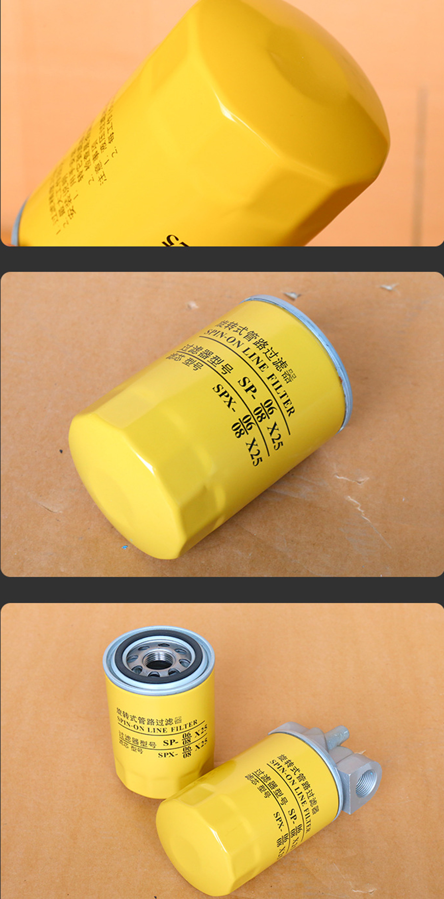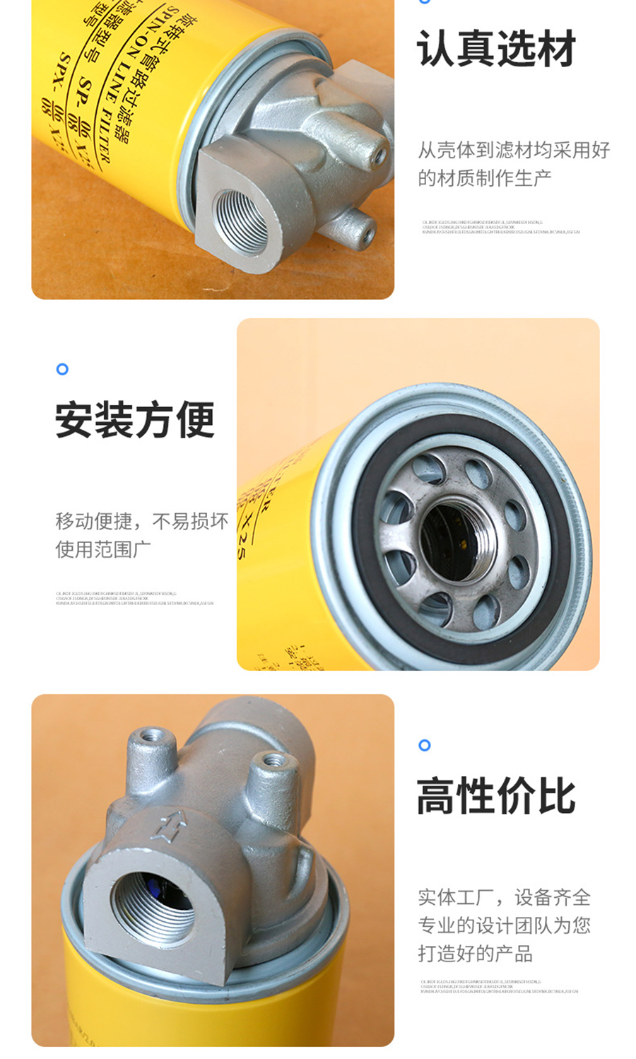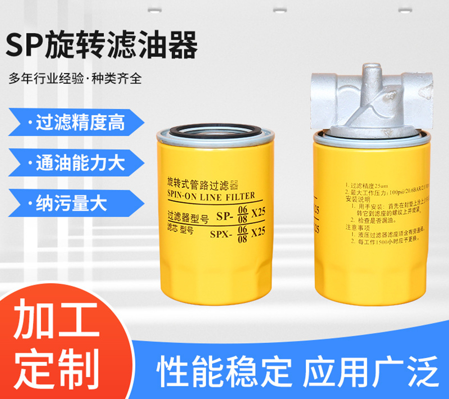 旋转式管路过滤器SP-06*25用于液压系统回油过滤或低压供油系统过滤,清除油液中由于元件磨损产品生产生的金属颗粒,以及其他杂质等污染物。提高油液清洁度,减少元件磨损和液压故障。 该系列的滤油器是由滤头和滤壳(芯)两个部份组成,滤头采用铝合金制造,滤壳(芯)采 用薄板钢板整体成型 新工艺冲刺制后与纸滤芯或化纤滤芯组合成钢壳滤芯,所以本系列滤油器具有外形美观,重量轻,堵塞时只需更换钢壳滤芯等优点。