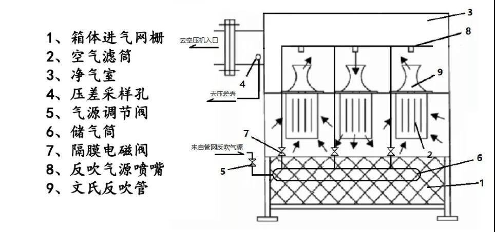 在压缩机吸气负压的作用下,该空气过滤器吸入周围环境空气,由于重力、静电、接触阻力留、惯性扩散等综合作用,空气中的灰尘沉积在过滤筒滤料的外表面,清洁空气在净气室汇合,经出气管进入压缩机。当PLC发出自洁指令,电磁阀会瞬间打开约0.1~0.2秒,送出一股脉冲气流,经喷射、反吹的作用把过滤筒外表面的积灰吹掉。所以此空气过滤器具有在线自洁功能,保证空压机连续工作。该空气过滤器的洁模式具有压差、定时、手动三种。自洁模式在控制仪上选择设定。